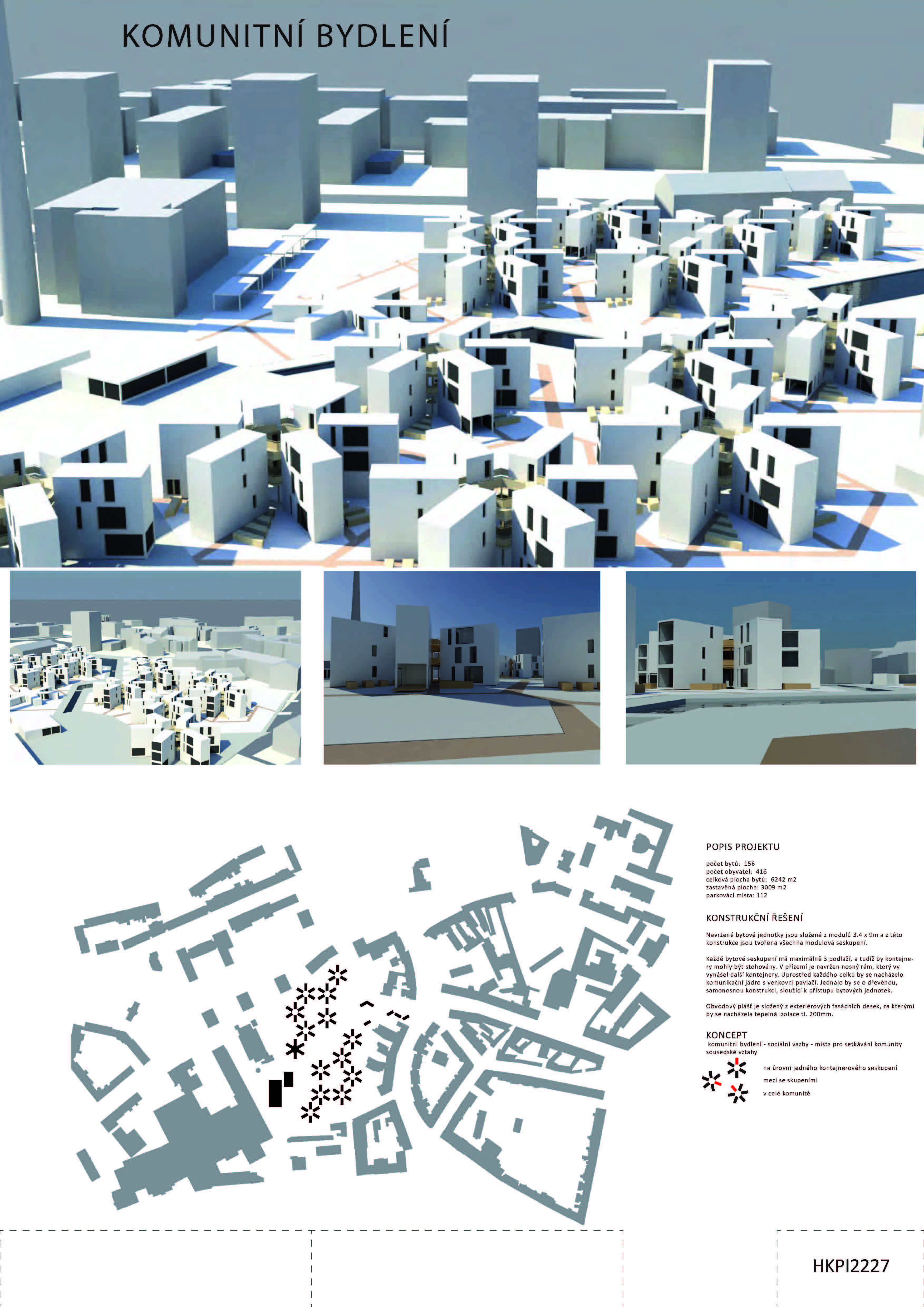 Navržené bytové jednotky jsou sl ožené z modulů 3.4 x 9m a z této konstrukce jsou tv ořena všechna modulová seskupení. Každé bytové seskupení má ma ximálně 3 podlaží, a tudíž by kontejnery mohly být stohovány. V příz emí je na vržen nosný rám, který vynášel další k ontejnery. Uprostřed každého celku by se nacházelo komunikační jádro s v enkovní pavlačí. Jednalo by se o dřevěnou, samonosnou konstrukci, sloužící k pří stupu bytových jednotek.
